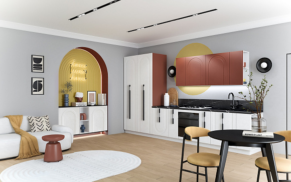 - Арочная фрезеровка фасадов кухни Арко Атриум — не просто декор, а стилистический код, в котором зашифрованы вечная красота и гармония. Её изгибы создают рельеф, в котором играет свет, а тени оживляют поверхность, превращая ее в часть живого пространства. Контрастный терракотовый верх фасадов словно напоминает о закатах над морем, а спокойный матовый низ оттеняет его, создавая баланс и глубину. Кухня становится не только зоной для приготовления еды, но и настоящей архитектурной доминантой интерьера.