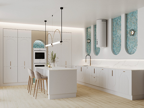 Наши дизайнеры переосмыслили древний миф, и на свет появилась кухня, сотканная из белоснежного песка пляжей греческих островов, с бирюзовыми акцентами морской глади и брашированной золотой фурнитурой. Они отсылают к Золотому руну или к утерянным сокровищам, лежащими на дне вместе с кораблями, павшими в сражениях со Скиллой и Харибдой.
