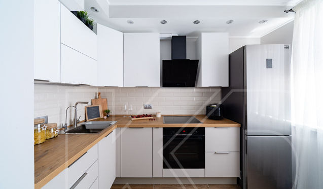 Сочетаемость с другими расцветками. Монотонность белого цвета легко разбавить контрастными деталями. Например, столешницей и открытыми полками черного цвета.