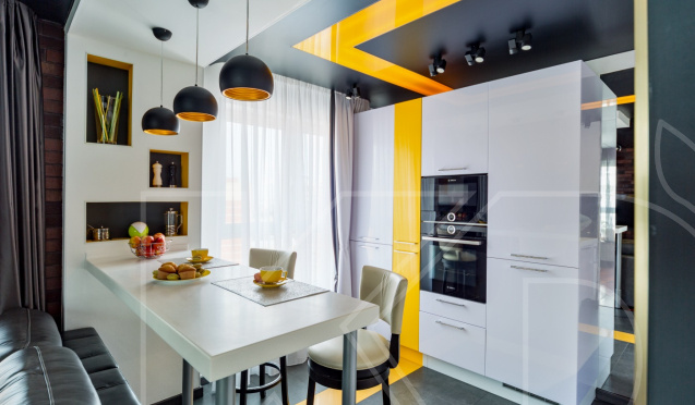Если вы желаете создать современный интерьер и ищите более броские сочетания, обратите внимание на кухонные гарнитуры, в которых точечно использованы яркие детали. Красные, желтые или фиолетовые полки, черная столешница и кухонный фартук с золотыми разводами – все эти элементы внесут в пространство динамичные нотки, сделают его более живым.