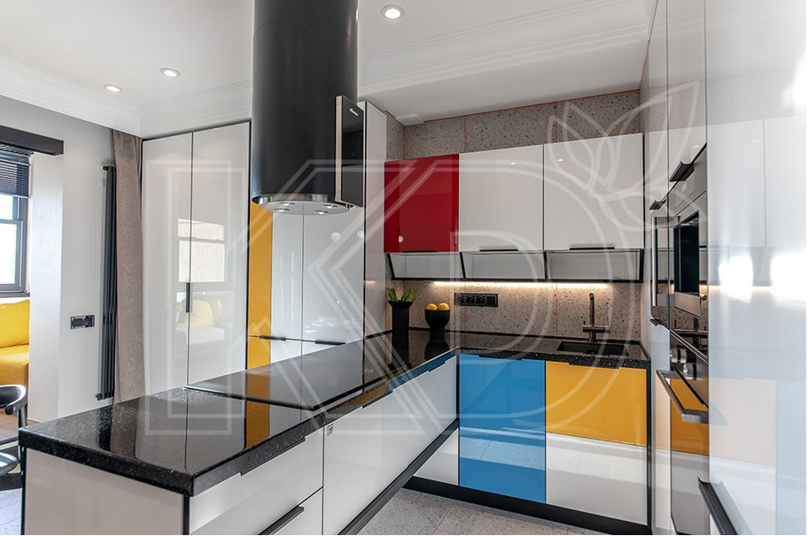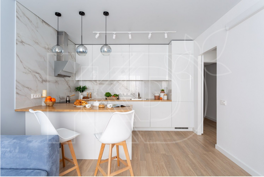 Для квартиры-студии или кухни-гостиной, которая не страдает от недостатка квадратных метров, можно предложить кухню хай тек с полезным дополнением в виде острова, полуострова или барной стойки. Подобная мебель поможет естественным образом разделить пространство на жилую и кухонную зону, увеличить рабочую поверхность, сделать помещение максимально удобным как для хозяев, так и для их гостей.