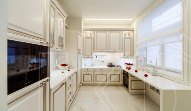 Производители предлагают кухонные гарнитуры в разных стилях, поэтому подходящий комплект можно подобрать для любого интерьера. Например, классический вариант следует встроить в помещение с мраморным полом, большими окнами и высокими потолками. Для таких классических гарнитуров применяется роскошная отделка в виде резьбы, лепнины и патины. Чтобы она смотрелась максимально органично, для отделки стен необходимо использовать обои с позолотой или рельефными узорами.