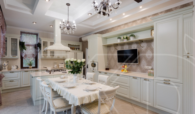 Большой загородный дом украсит модель в классическом стиле. Подобную мебель отличает выверенная геометрия, симметричные линии и роскошная отделка. Для оформления фасадов используются резные узоры, лепнина, мозаики, патина и позолоченные элементы.
