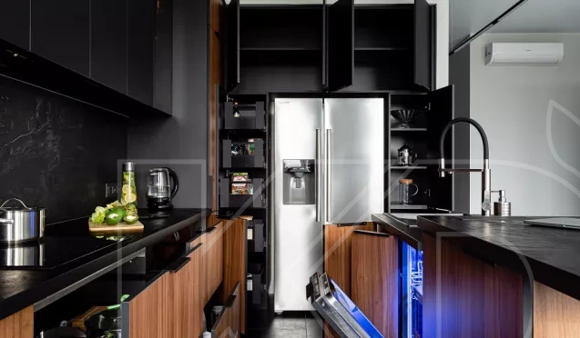 Прямой черный кухонный гарнитур отличается линейным дизайном с прямой столешницей и шкафами, расположенными вдоль одной стены. Прямая кухня идеально подходит для небольших помещений или квартир, поскольку максимально увеличивает доступное пространство, обеспечивая при этом достаточно много места для хранения и работы.