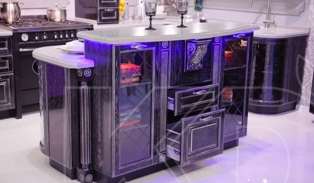 Островная кухня — популярный вариант кухни в черном цвете с центральным островом, который служит рабочей станцией и местом для хранения. Кухня с островом хорошо смотрятся в больших помещениях и обеспечивают достаточно много места для приготовления пищи.