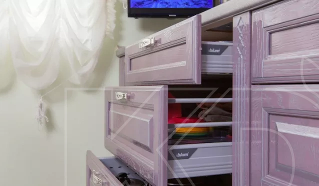 Рассматриваемые кухни фиолетовых цветов в каталоге кухонь на сайте изготавливаются на специализированном современном оборудовании с использованием передовых технологий. Благодаря этому гарнитур отличается наличием: