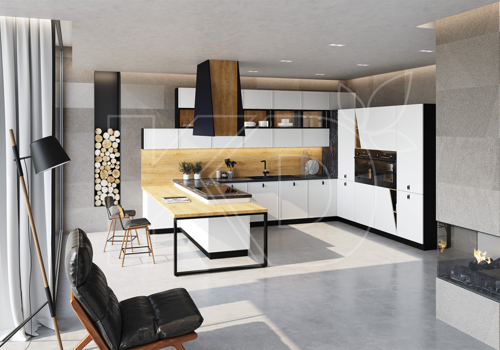 Гарнитур с островом – подходящая модель для квартиры-студии или загородного дома. С помощью такого комплекта можно визуально отделить обеденную зону от гостиной, используя островную конструкцию в качестве стола для приема пищи или дополнительной рабочей поверхности.