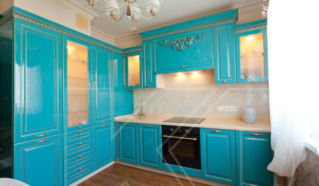 Зеленая палитра тоже хорошо смотрится в глянце. Подобная расцветка действует успокаивающе, настраивает на позитив. Салатовые и мятные оттенки подходят для малогабаритных кухонь. Изумрудные, малахитовые, хвойные оттенки гармонично смотрятся в просторных помещениях с хорошим дневным освещением.