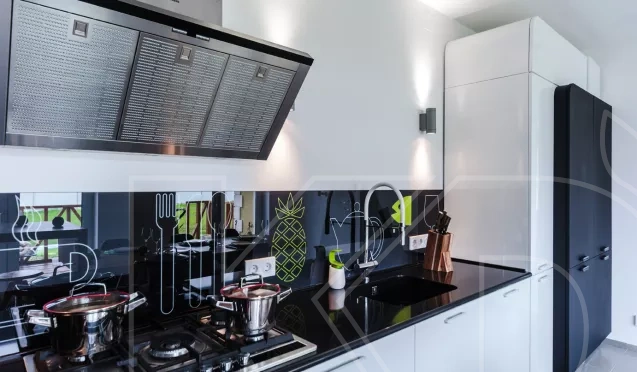 Черный глянец выглядит особенно изысканно и стильно. Подобную расцветку рекомендуется использовать в просторных помещениях, расположенных на южной стороне. Для оформления черных поверхностей используются стальные элементы лаконичной формы.