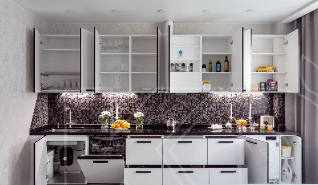 Широкий ассортимент. Производители выпускают глянцевые версии с угловой, линейной, островной, полуостровной, П-образной и параллельной планировкой.