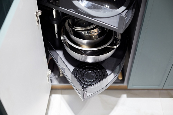 - шкафы с поворотными механизмами — помогут максимально использовать угловые пространства, которые обычно остаются не использованными.