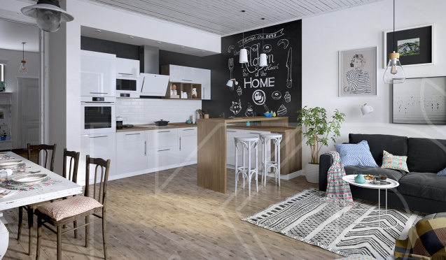 Белые скандинавские кухни прямой формы позволяют создать стильный интерьер малыми усилиями. Вы можете выдержать светлом цвете все помещение, а чтобы оно не смотрелось слишком скучно использовать яркие акценты.