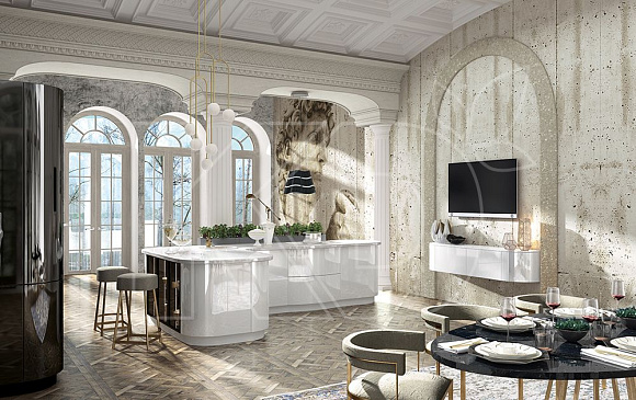 Компания «Кухонный Двор» производит большие кухни для частных домов на собственном производстве в Московской области. На гарнитур действует гарантия 12 лет.