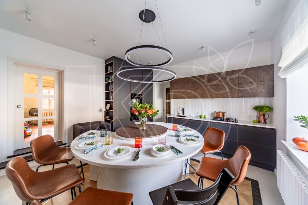 - Классика. Вечно актуальный вариант уместен и в частном доме. Он подойдет кухне с большими окнами и высокими потолками.