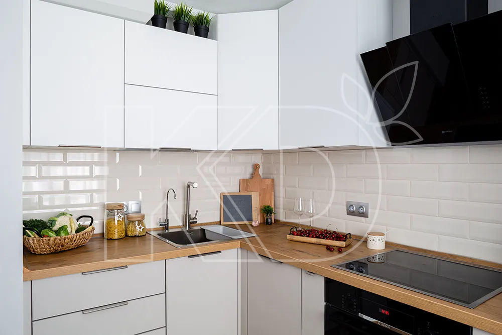• Угловая. Это самое распространенное решение. Угловая кухня позволяет грамотно разместить рабочую зону и места для хранения таким образом, чтобы хозяйке было удобно перемещаться по комнате.