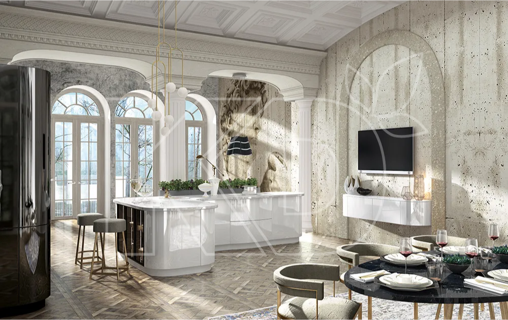 Это просторное помещение, где члены семьи проводят много времени. Здесь хозяйка готовит еду и общается с близкими и гостями, не чувствуя себя изолированной от окружающих.