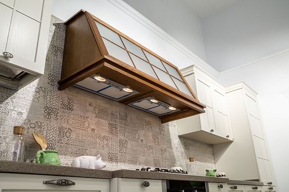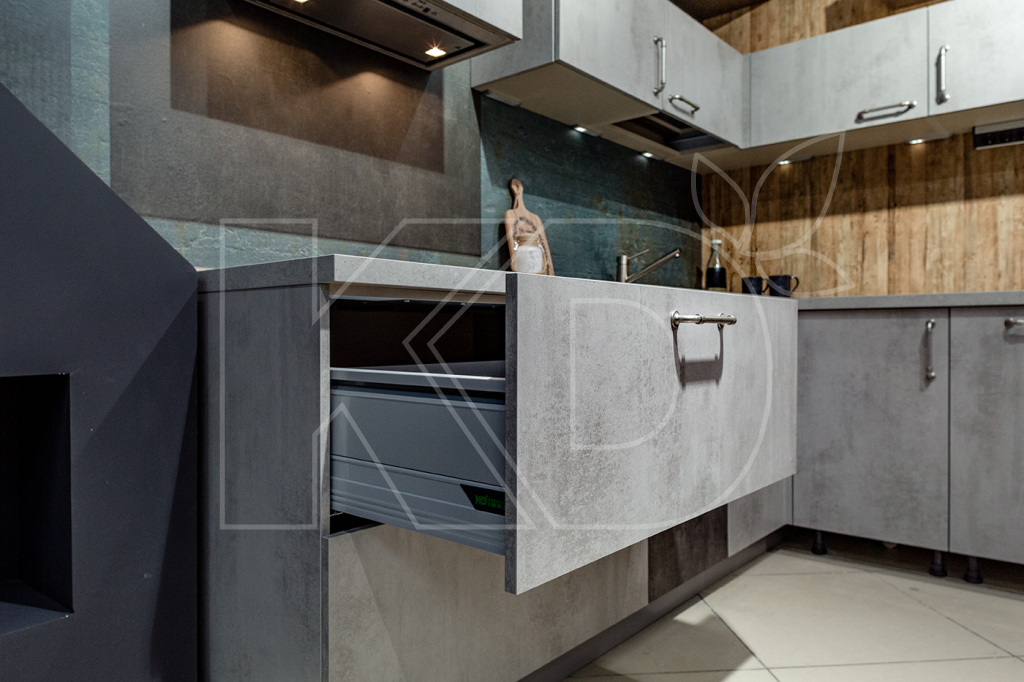 Это еще одна конфигурация, на которую стоит обратить внимание тем, кто решил купить узкую кухню в Москве. Если в конце пространства нет окна и батареи, то угловая расстановка – это отличное решение. В рамках нее гарнитур размещают в конце помещения вместе с мойкой и холодильником. Это позволяет освободить максимум пространства в начале комнаты и в центре. На свободной территории можно поставить обеденный стол, диван, шкаф-пенал или другую мебель.