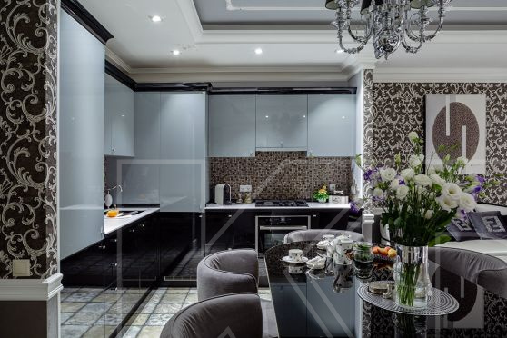 Выбирая мебель для кухни, обратите внимание на ее цвет. Так, дизайнеры советуют использовать в небольших помещениях гарнитуры светлых оттенков с глянцевыми фасадами. Такая расцветка и фактура визуально расширяет пространство, делает его более светлым и просторным.
