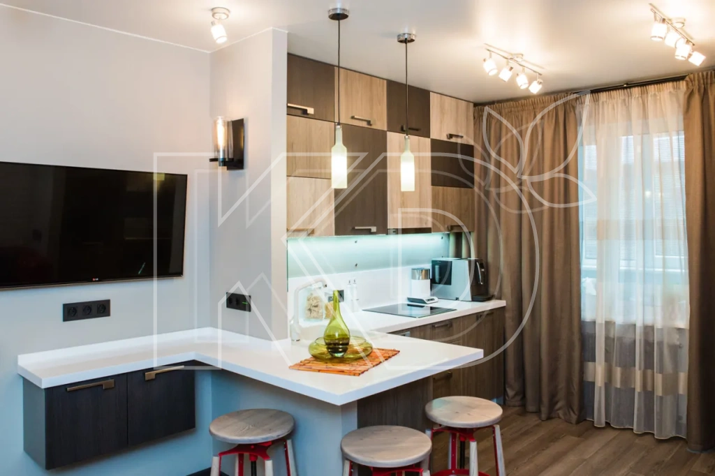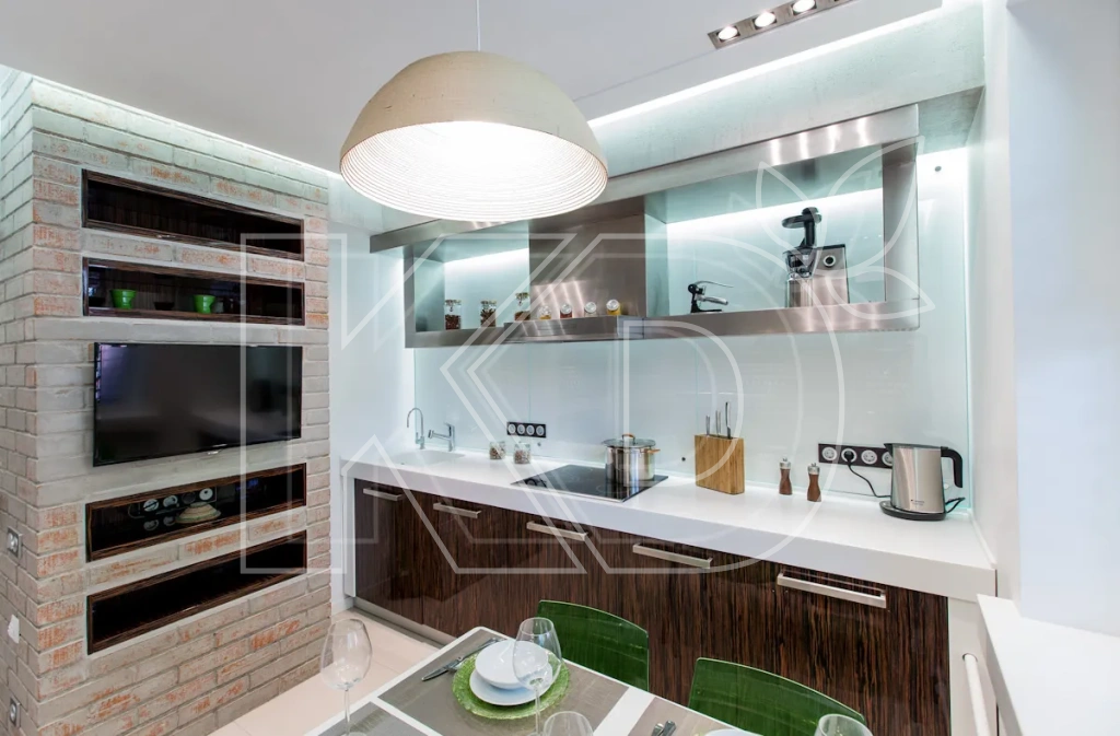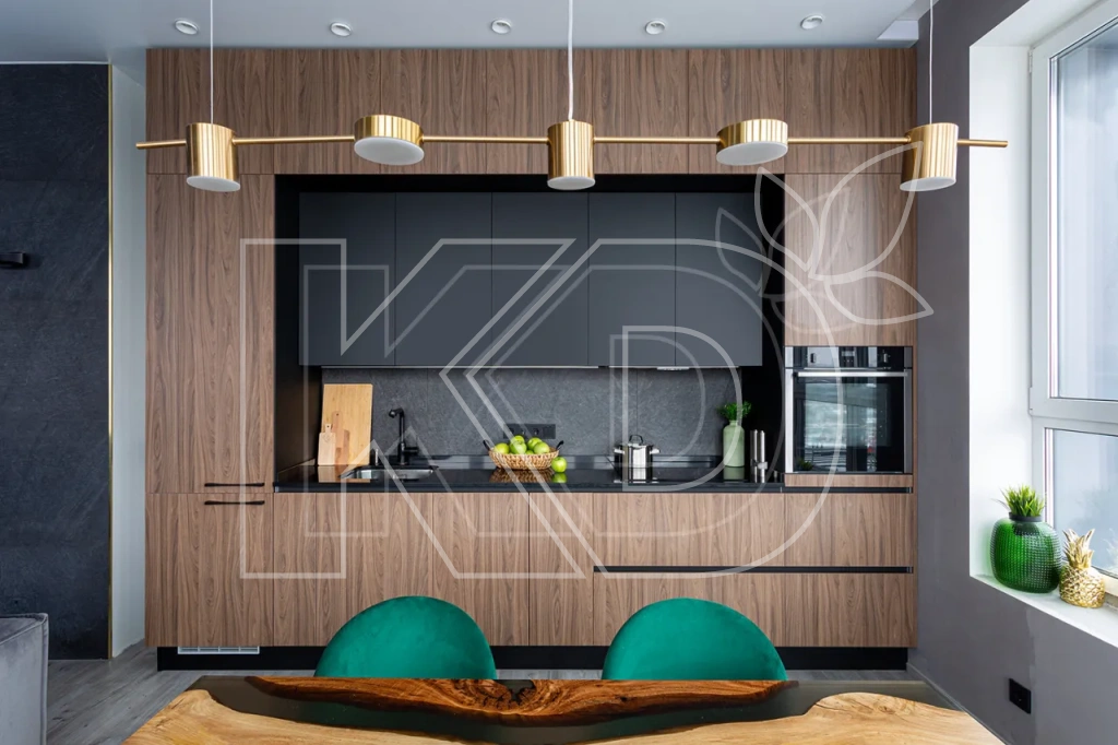 В просторных квартирах-студиях и отдельных помещениях площадью от 12 квадратных метров часто используют островные комплекты. Модули при такой планировке устанавливают вдоль одной или двух стен, в виде буквы П. Дополнительные навесные полки и шкафы часто размещают у окна.