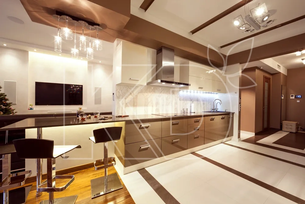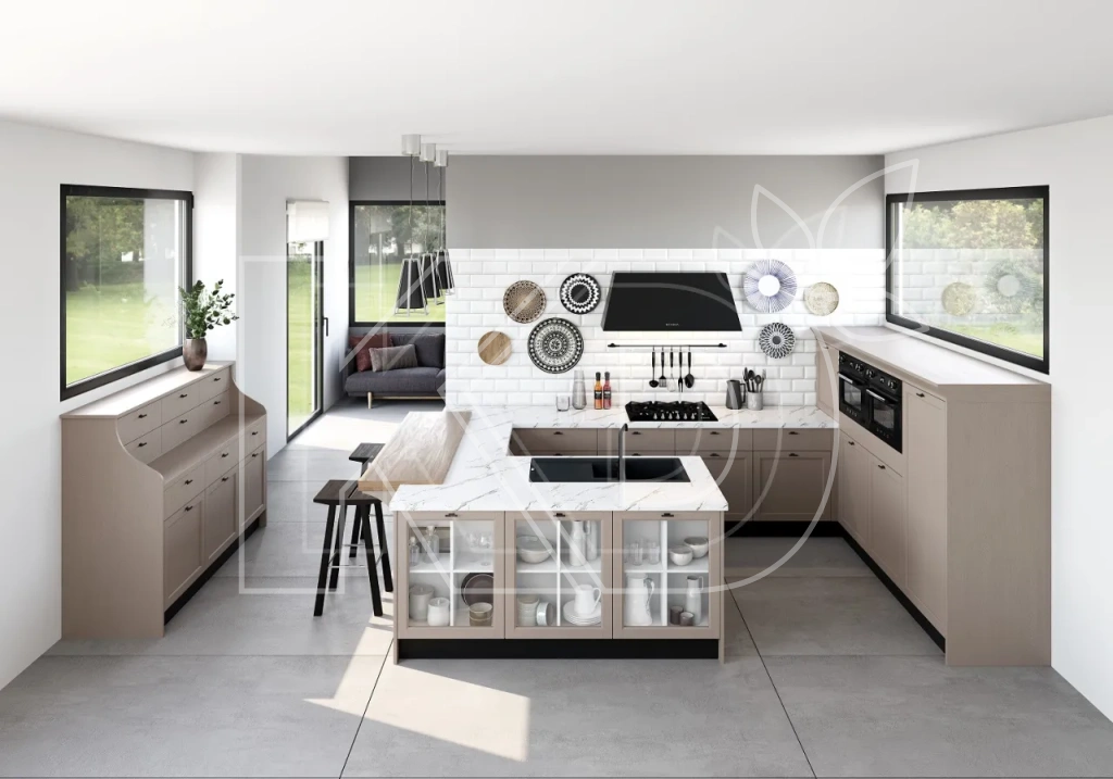 Владельцы просторных квартир и загородных домов часто прибегают к применению П-образных комплектов. Благодаря этому обеспечивается несколько рабочих зон и большое количество места для посуды, бытовой техники.