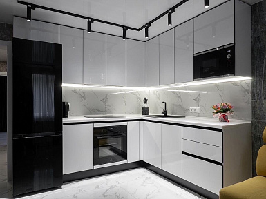 Угловая кухня – идеальный вариант для среднего по размерам помещения. При такой планировке шкафы устанавливаются вдоль двух смежных стен. В образовавшийся на их стыке угол устанавливают дополнительный шкаф, полку или раковину.
