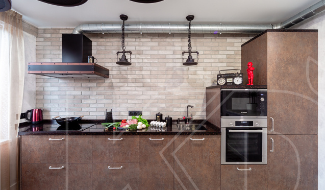 Кухни лофт. Подобные версии подходят для создания непринужденных интерьеров, в которых остаются открытыми системы коммуникации, не декорируется кирпичная кладка или штукатурка. В компактную комнату лучше внедрять комплект лофт с открытыми навесными полками вместо верхнего ряда шкафов. В этом случае сохранится необходимый простор и воздушность.