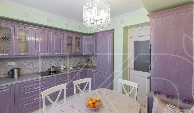Фиолетовые кухни – еще один нестандартный вариант. В неоклассических моделях фиолетовый может использоваться точечно. Например, для отделки открытых полок.