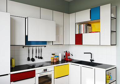 - кухонный гарнитур с контрастными решениями, фигурными вставками на дверцах и раздвижных створках;