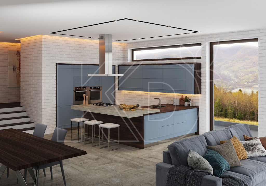 Получить эффектный интерьер позволяет небесно-голубой тон. Кухня такого цвета будет органично смотреться в небольшой комнате. Также небесно-голубая расцветка подходит для пространств, в которые попадает большое количество света. Подобная расцветка визуально снижает температуру в помещении, делает его более прохладным.