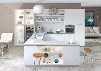 На этапе проектирования определяется не только форма мебели, но и то, чем будет укомплектован кухонный гарнитур. Количество выдвижных ящиков, открытых и закрытых полок выбирается с учетом размеров комнаты и уровня ее освещения.