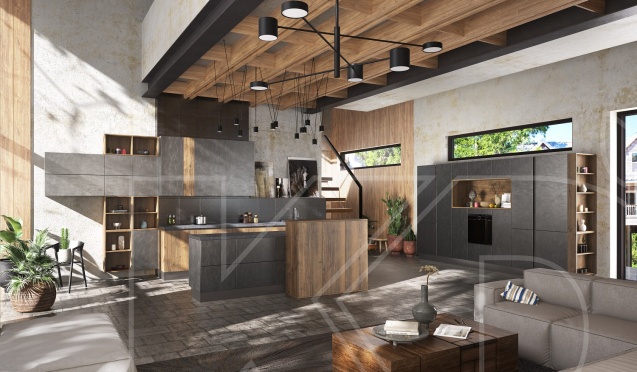 Комплекты в стиле лофт выбирают ценители комфорта и простоты. В этом случае при оформлении помещения используются металлические элементы, кирпичная кладка и декоративная штукатурка. Стиль предполагает некоторую непринужденность, которая выражается открытыми коммуникациями, минимальной отделкой стен. Декоративное оформление фасадов очень скромное – стеклянные или цветные вставки, рамки.