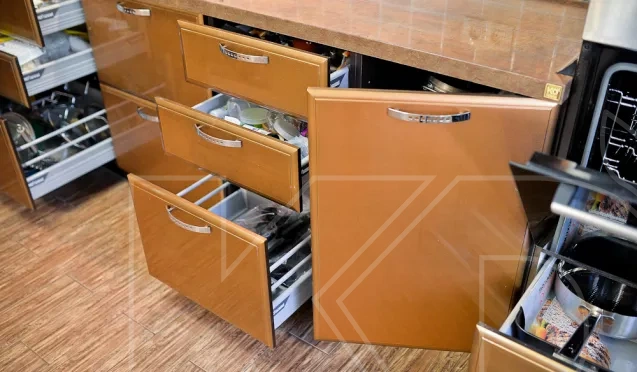 Дизайн подобной модели запоминающийся и оригинальный. Если вы предпочитаете эффектные версии, то такой гарнитур станет украшением вашего кухонного пространства.