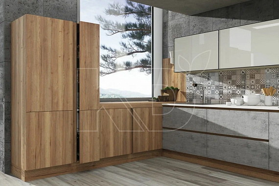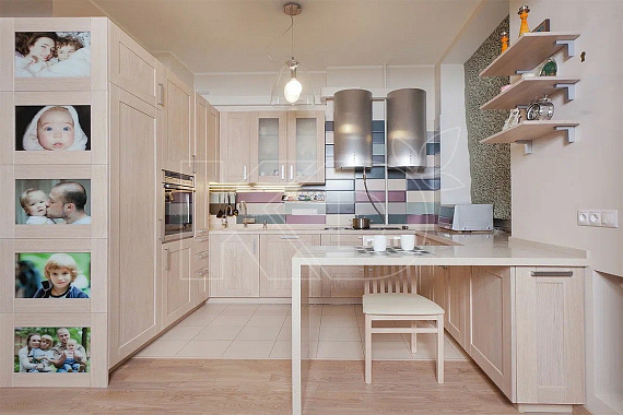 В небольшом пространстве лучше использовать природные материалы. Стены покрасить и отделать панелями из дерева. Полы на кухне уложить массивом, покрыть лаком и покрасить молочной краской. Как вариант – использовать в качестве напольного покрытия керамогранит, имитирующий натуральный камень, или ламинат.