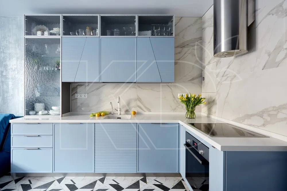 Заказать кухню синего цвета в классическом или современном стиле можно в бренда «Кухонный двор». Для изготовления мебели производитель использует качественные материалы и фурнитуру.