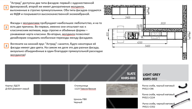 Кухня Астрид – это кухня в современном стиле, которая станет сердцем Вашего дома. Ведь эта комната является основной, где собирается вся семья, где начинается день и общаются близкие люди. Поэтому интерьер и мебель в этом помещении играет большую роль. Ведь это гарантия комфорта и удобства каждого члена семьи.