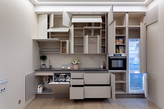 Даже если существует потребность в большом количестве зон хранения, нужно соблюдать принцип умеренности, чтобы не заставить пространство. Оставьте свободным проход между нижними модулями не менее 90 см. Используйте вертикальные решения, угловые модули, выдвижные корзины, волшебные уголки и системы хранения в цоколе пеналов. Чересчур перегруженное пространство часто мешает уборке и утяжеляет интерьер. Минимализм и функциональность — вот два главных принципа современной кухни.