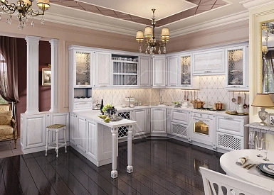 Гарнитур, в котором модули устанавливаются вдоль двух смежных стен, называется угловым. Подобная конфигурация позволяет рационально задействовать свободный угол. В него обычно встраивают шкаф или мойку.
