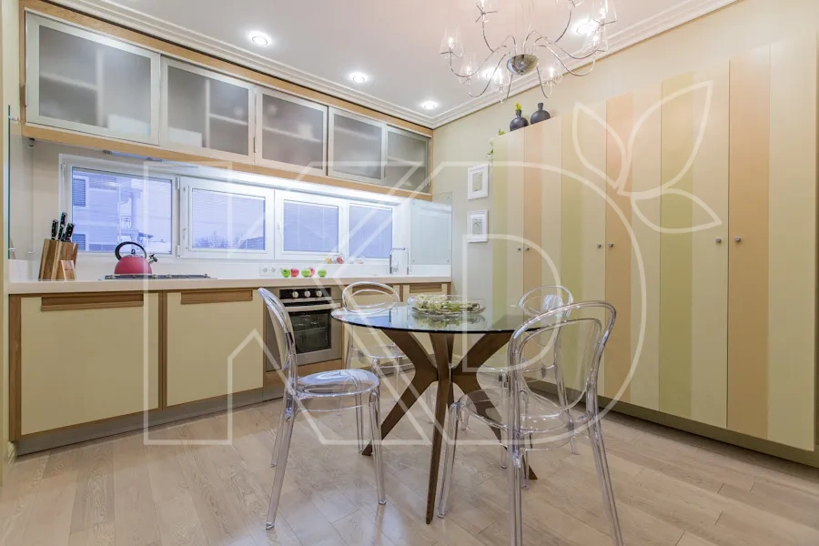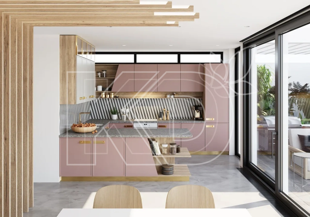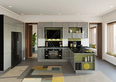 Планировка, при которой модули располагаются в виде буквы «П» вдоль трех смежных стен, обычно используется в больших помещениях. Подобное расположение считается одним из наиболее эргономичных, потому что позволяет придерживаться принципа рабочего треугольника. Холодильник, плита и мойка размещаются на одинаковом друг от друга расстоянии.