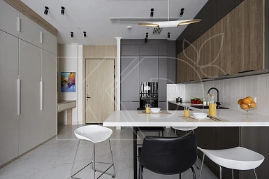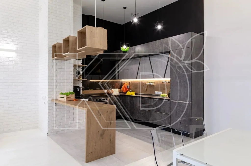 Барная стойка может использоваться в качестве дополнительной рабочей поверхности или обеденного стола. Другой плюс такой конструкции заключается в том, что она может использоваться для зонирования пространства.