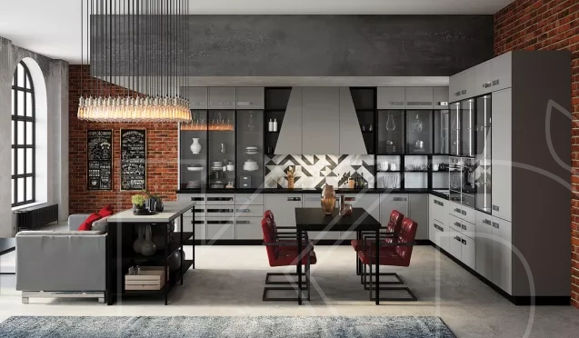 На серой кухне, выполненной в лофте, хорошо смотрятся бетонные или кирпичные стены. Маленькое помещение желательно оборудовать светлым гарнитуром. Для разбавления нижних темных фасадов используйте нейтральный белый верх.
