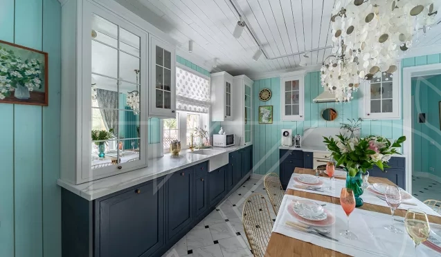 Эстетичность. Кухни в синих тонах привлекают внимание стильным дизайном и расцветкой. Подобные модели декорируют различными вставками, рисунками, резьбой, позолотой.