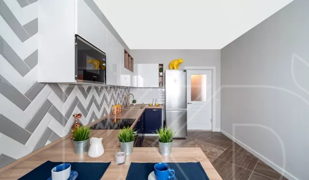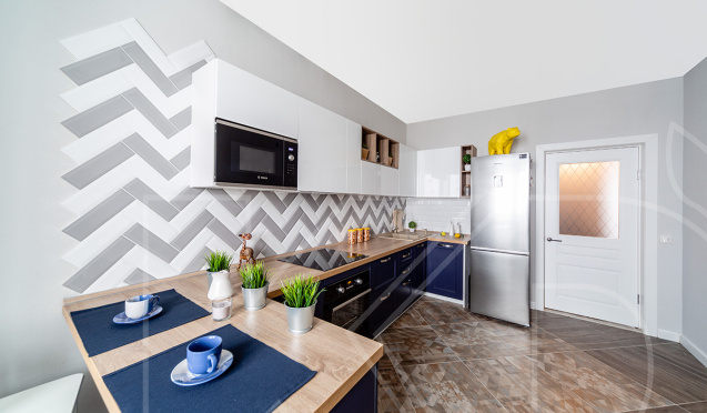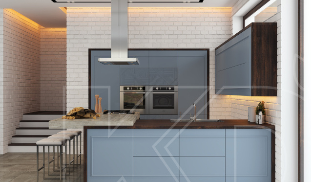 выбирая кухни в синих тонах, можно достичь гармонии в любой кухне-студии. При этом не нужно тратить время и деньги на разграничение пространства.