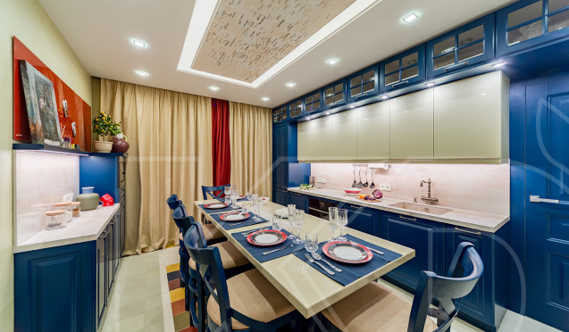 синяя палитра цветов отлично гармонирует с белым оттенком. Благодаря этому получается создать невероятную атмосферу роскоши и благополучия. Такие цветовые решения располагают к продолжительным беседам за кружкой горячего чая или ароматного кофе;
