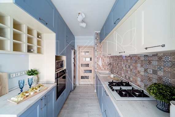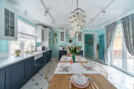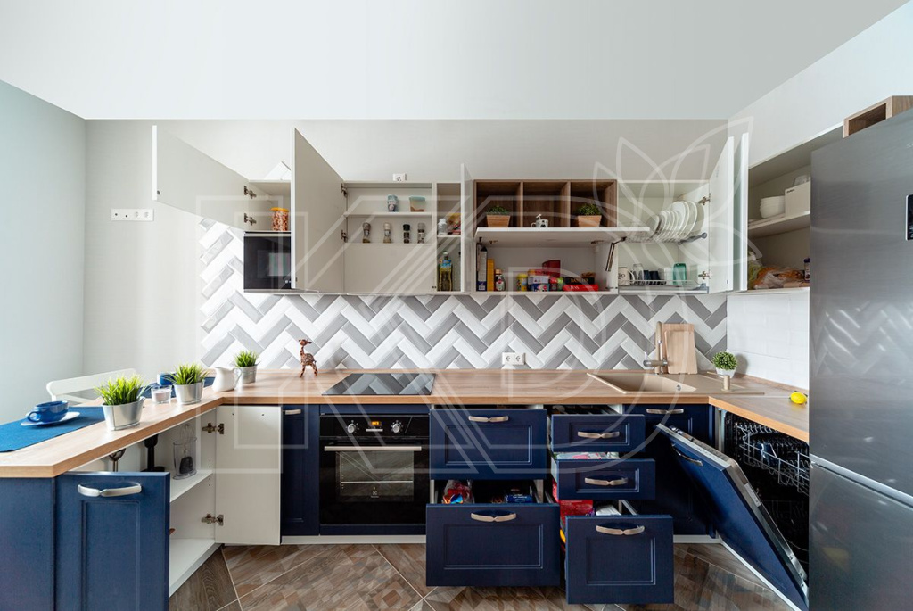 Чтобы синяя кухня в интерьере смотрелась максимально гармонично, необходимо тщательно продумать убранство помещения. Именно от этого зависит, насколько комфортно будет находиться в нем в дальнейшем. Так, для отделки стен в небольшом пространстве лучше выбрать светлую гамму в кремовых, бежевых или белых тонах. Наиболее подходящее решение – однотонные обои или плитка. Также приветствуются ненавязчивые абстрактные рисунки в виде едва заметных разводов или пятен. В просторной комнате больше возможностей для экспериментов. Поэтому синюю кухню в интерьере с большой площадью можно обыграть обоями с выраженными геометрическими узорами, изображениями флоры и фауны.