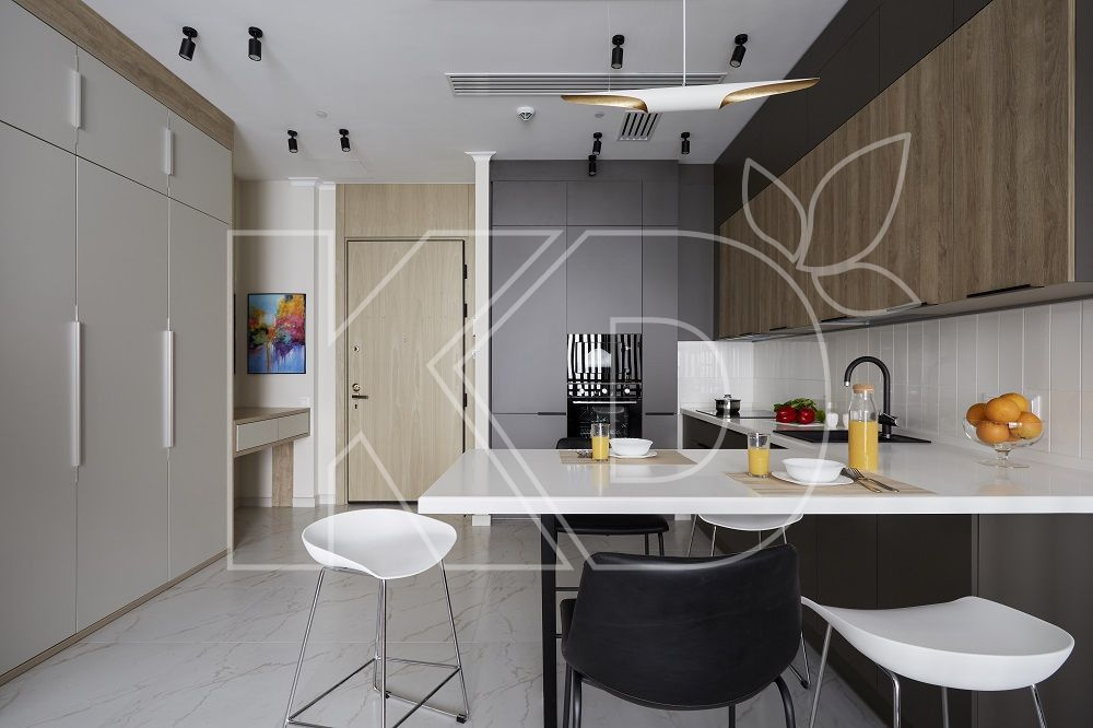 Довольно часто встречаются гарнитуры в стиле сканди с элементами в темных цветах. Например, черными столешницами и навесными полками. Подобные варианты смотрятся очень эффектно. Несмотря на наличие темных деталей, в них сохраняется воздушность и невесомость.