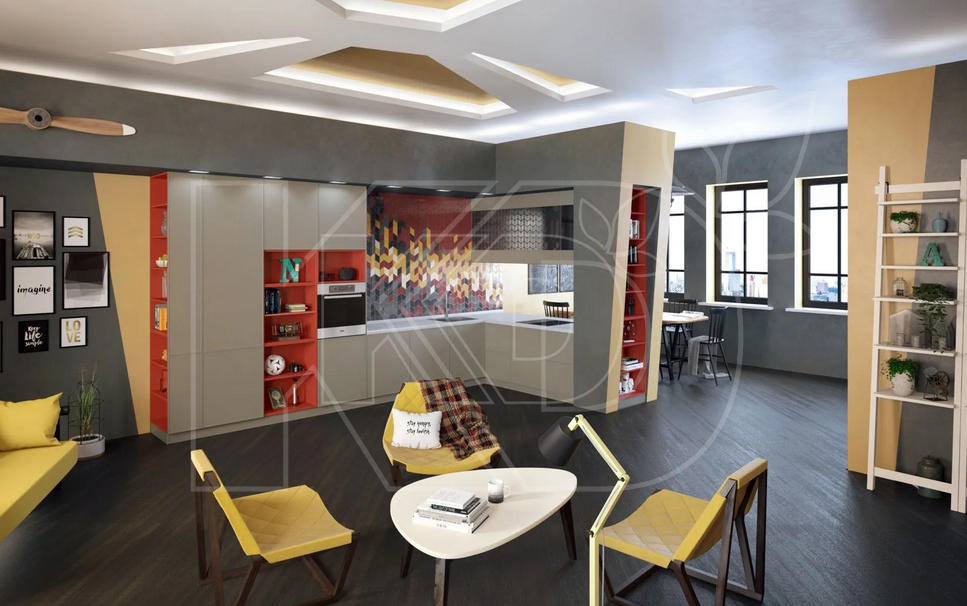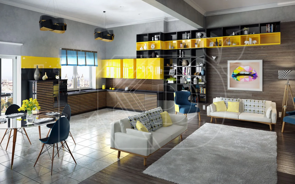 Цветовая гамма мебели разнообразна – в нее входят как спокойные и строгие, так и яркие и насыщенные оттенки. Кухня модерн может быть серой, черной и коричневой, бежевой и белоснежной, синей, желтой, зеленой, розовой и даже золотой. Подчеркнуть безупречные формы фасадов помогает покрытие из ультраглянцевой эмали.