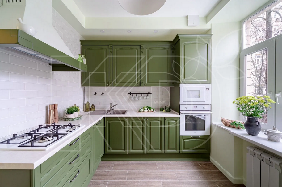 - Стилистическое разнообразие: угловую кухню оливкового цвета можно приобрести как классическую, так и современную.