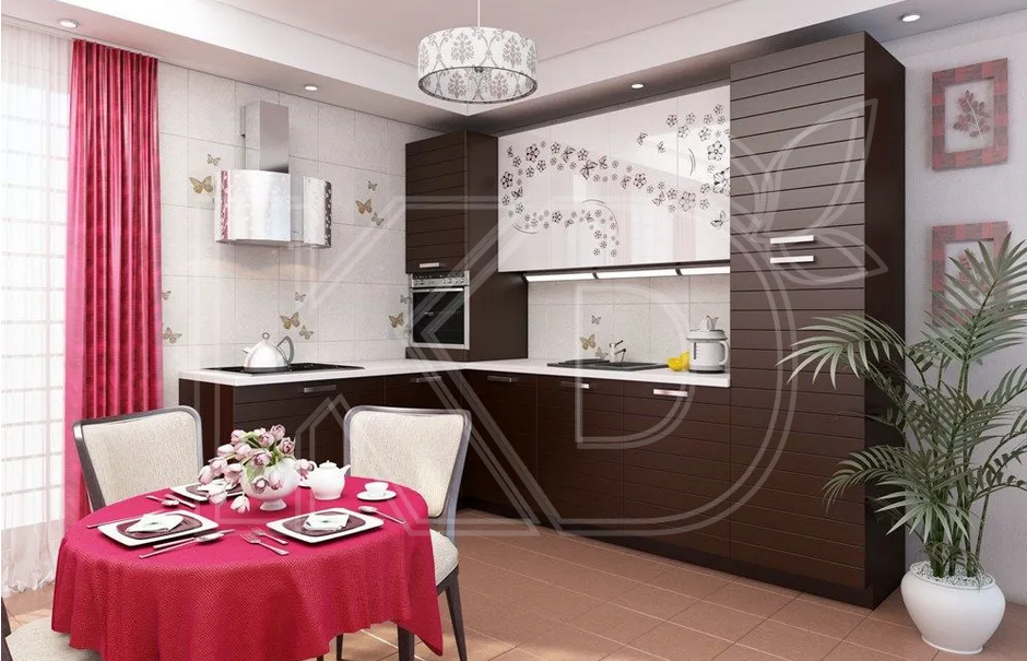 В наличии более 500 разновидностей оттенков, поэтому угловая кухня может быть как монохромной, в сдержанных тонах, так и яркой. Наиболее выразительно смотрятся гарнитуры, в которых объединены несколько цветов. При желании можно привлечь внимание к фасадам с помощью напыления, меняющего цвет под разным углом освещения, или фотопечати.