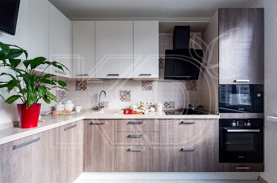 - Универсальность. Угловые кухни подходят как для просторных, так и компактных интерьеров. Нужно лишь определиться с габаритами и числом желаемых модулей. Если помещение небольшое, можно использовать двойной ряд верхних модулей, что позволит разместить всю необходимую утварь и продукты даже для большой семьи.
