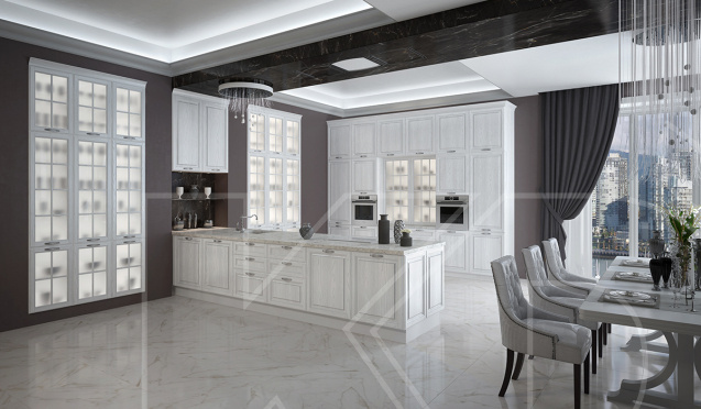 Кухни неоклассика. В таких гарнитурах гармонично сочетаются строгие классические линии и функциональность модерна. Для удобства их оснащают большим количеством полок, ящиков, шкафов. Расцветка неоклассических комплектов может быть как однотонной, так и комбинированной. В качестве декора применяются вставки из металла и стекла, эффектная фурнитура.